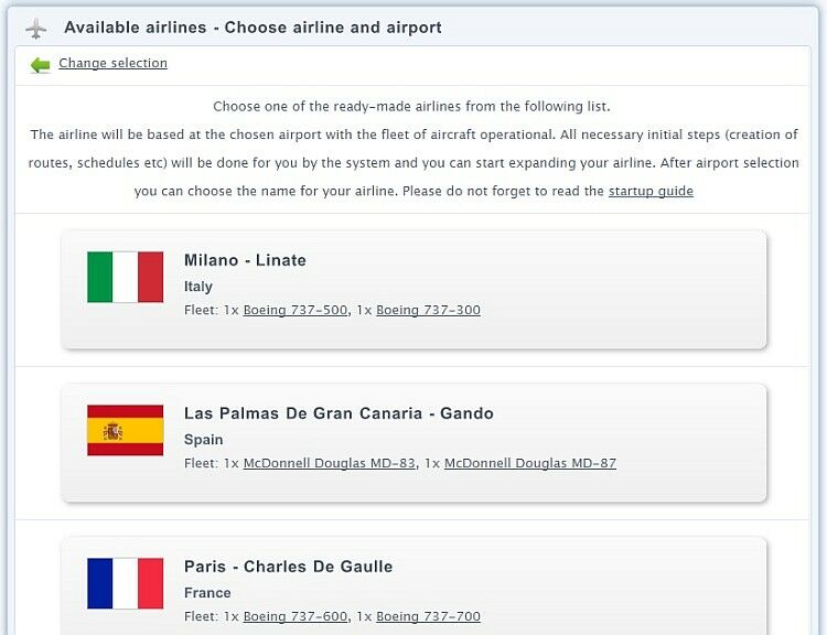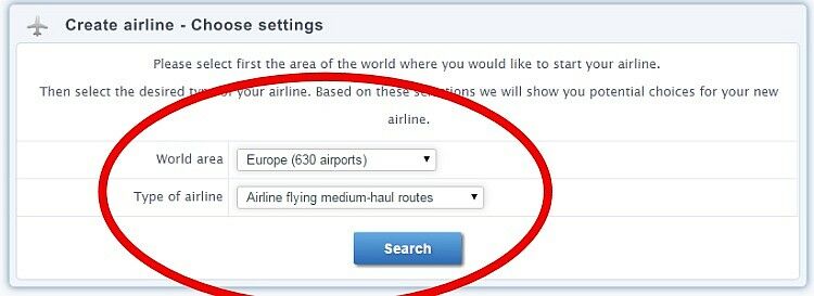 When you have joined the game world, you will be first asked for the type of airline you would like to create. You can choose the area of the world (continent) and type of airline - these are: