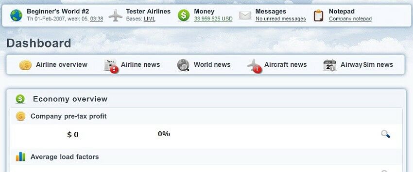 Even though your Dashboard looks very empty, your airline has active aircraft and routes. The Dashboard is the main location for news and events happening in the game world. It also shows a quick overview of your airline - but since we are new and just started, everything is still zero - but the data will appear soon (after the game day changes).