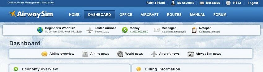 The top section contains the main navigation. Below that is the status bar with the details of the current game world and your airline. This status bar includes the current time in the simulation, the money your airline has in it's bank account, and notifications of any incoming messages. Below this is the actual content of the page.