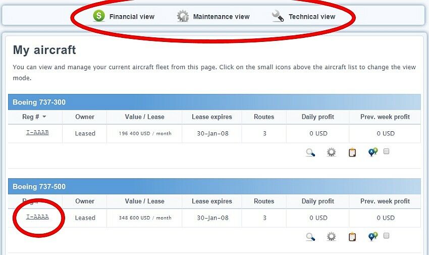 The information on your aircraft fleet can be seen on many different pages but the best overview is the My Aircraft page (navigation: Aircraft -> My Aircraft). This page displays the vital statistics of all your planes, and you can click on each aircraft for more information.