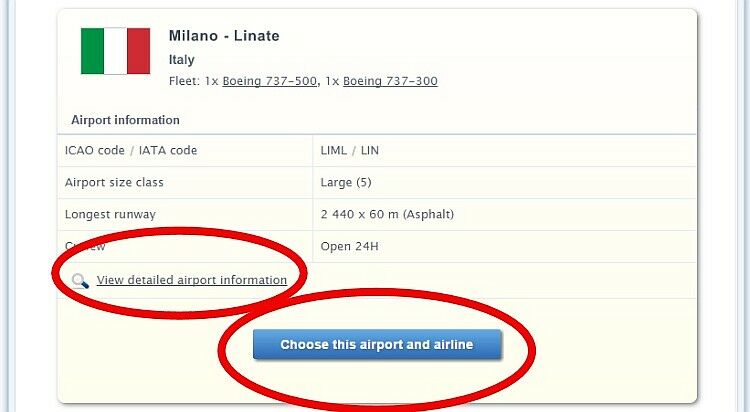 In this example we have several good choices, but we'll select the first one, Milano-Linate. Clicking the airport will select it and will show additional brief details of the airport.
