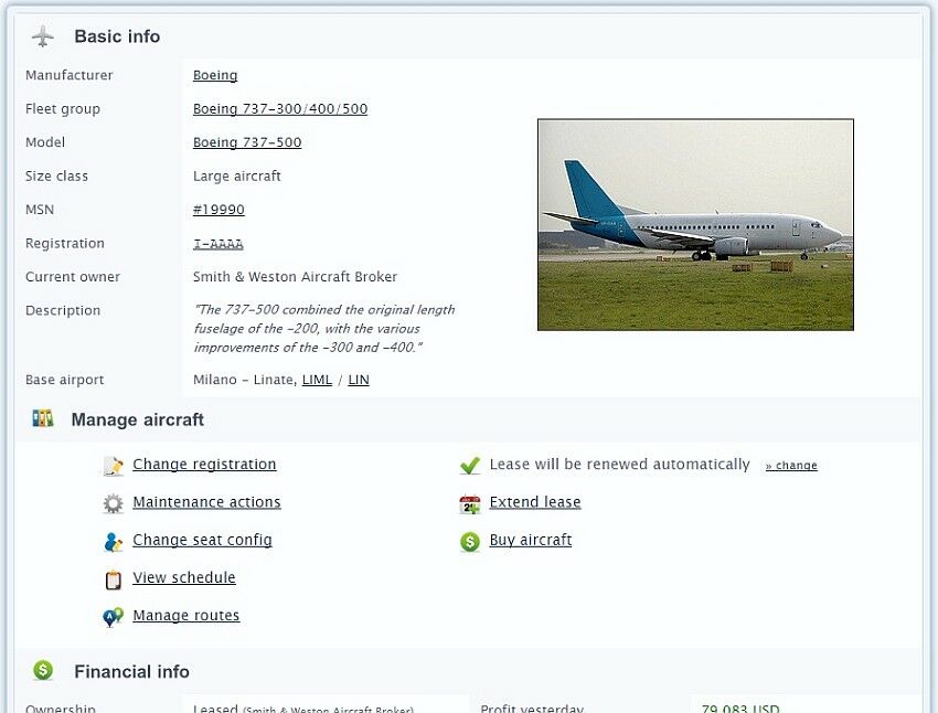 All of your aircraft are initially leased from computer-controlled aircraft brokers. These aircraft are old (not factory new) and the duration of the lease deal is 1 year. Leases can be terminated early, or they can be extended before they end. In normal cases the automatic extension of leases is turned on (your staff will make a 1-year renewal of each lease before they end - unless you tell them otherwise). You may also lease aircraft from other players (or even lease your planes to them once you own them) - these are covered later in other manual chapters.