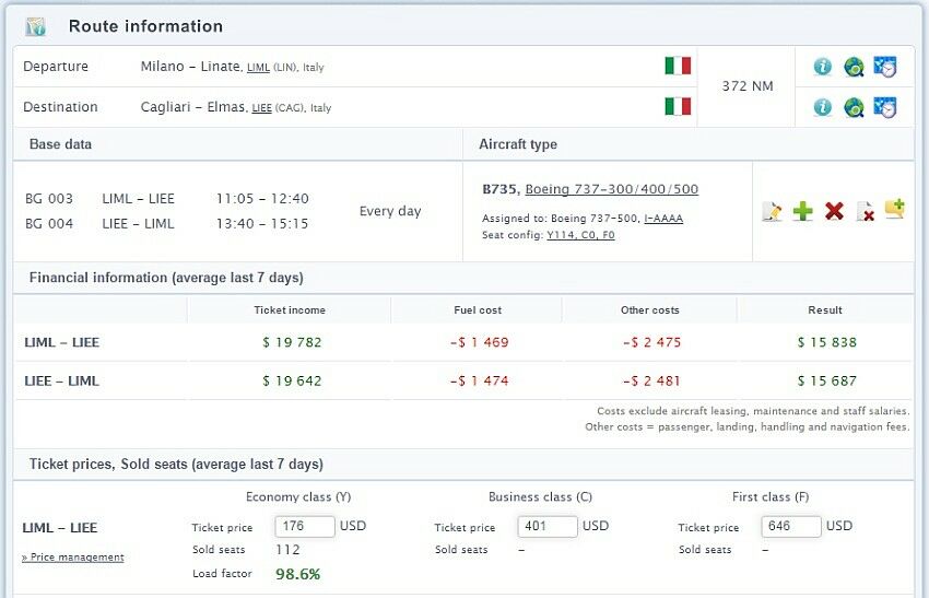 In our example image the averge load factor of all routes of this plane is 98.3% which is very high and we should increase the ticket prices of any route that has approximately over 90% load factor. Usually the optimal sweetspot for maximum revenue is around 80-90% load factor - but this depends on individual route and possible competition. More about routes later....