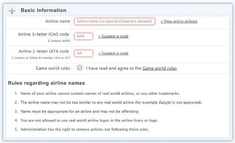 Please also take care that your airline name is not too similar to any other airline already in this game world. You may view a list of airlines participating from the "View active airlines" link next to airline name input box.
