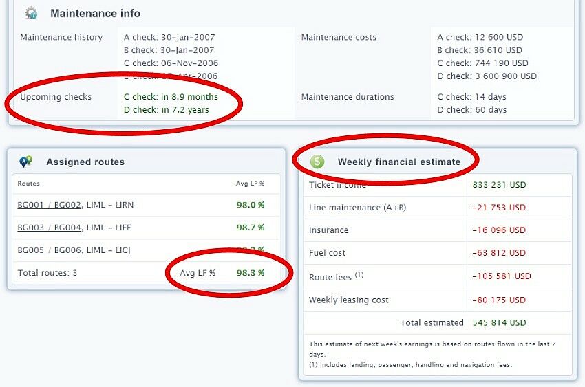 Firstly the maintenance area tells you the time until next "heavy" (C / D) maintenance checks, and the costs and durations of them.