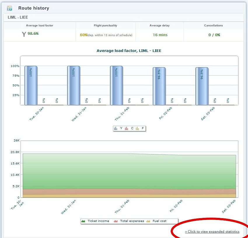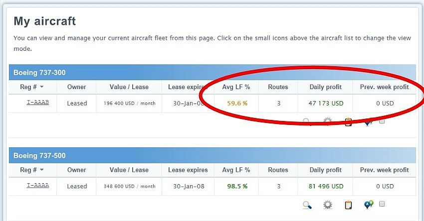 Finally - the My Aircraft page will also show the same overview of profits and load factors, once the results have appeared after the game day has changed (every 20-30 minutes).