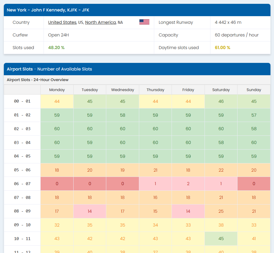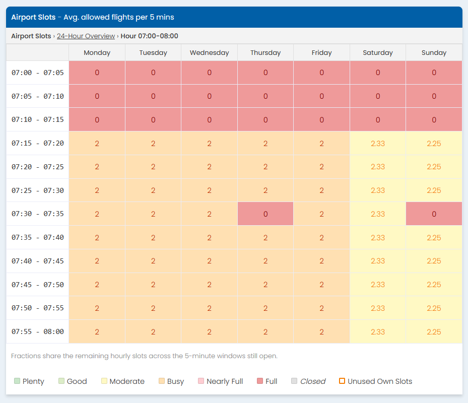 The slot page contains brief information on the airport including the information about airport opening times and hourly capacity. The slot view itself is divided into 7 days and then into 24 hours, each forming a slot block. The blocks are color coded depending on the ratio of slots available. The number shown at each block is the number of slots available at that hour.
