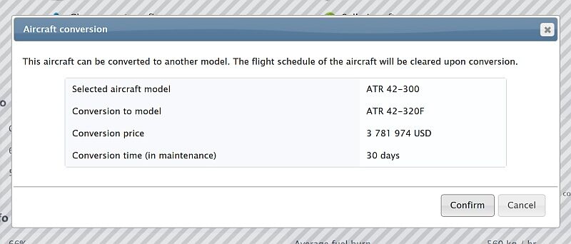The conversion will update the aircraft to the new model and will change most of the specifications. Please consult the aircraft information pages for the details of the new aircraft model before conversion. The conversion window will only display the brief details for you, such as the new model, price and maintenance duration.