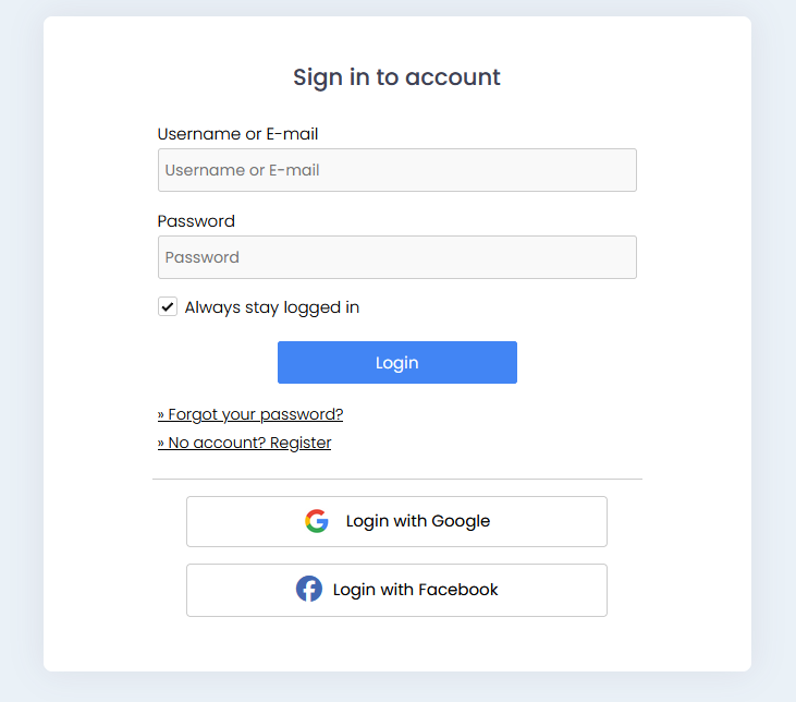 The social media login options are Google and Facebook.