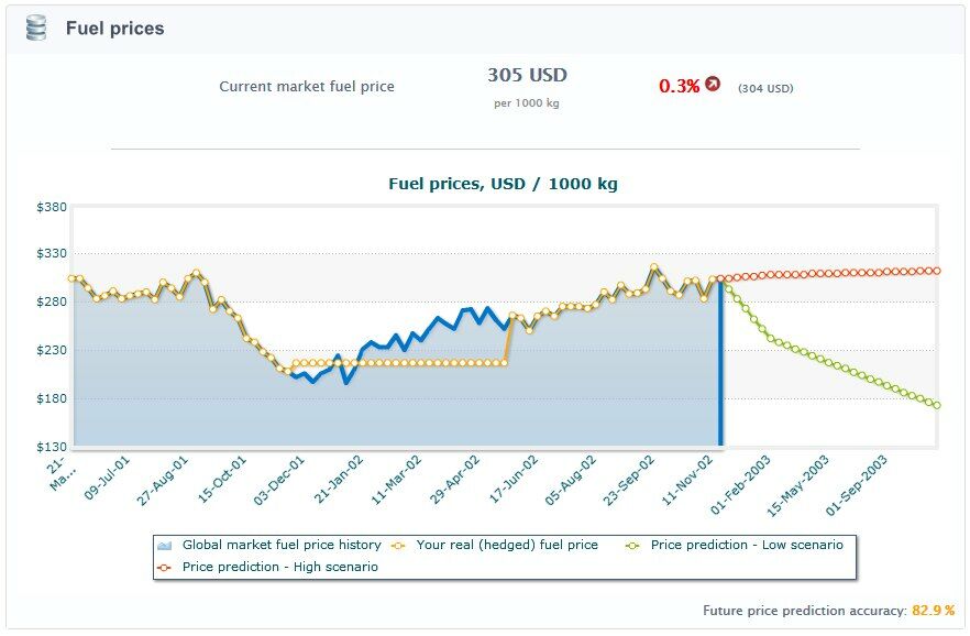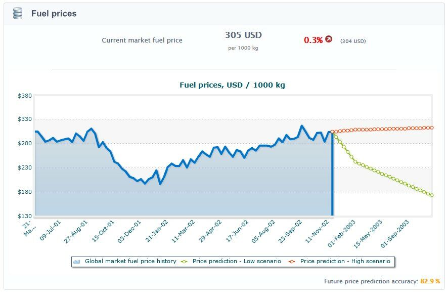 Your economic and finance department staff will prepare a prediction of the future fuel prices. This prediction can be viewed from the same chart with the historical fuel prices and it includes two scenarios: "low price" and "high price". The future fuel price will be usually somewhere in between these two ends of the prediction. Please keep in mind that their prediction is never fully accurate, and the accuracy goes down if you have too few staff employed and / or staff morale is low. Accuracy prediction improves closer to the date.