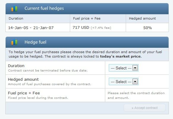 Your airline may hedge up to 100% of the fuel usage of the airline. The Fuel Hedges section of Fuel Management page displays a simple form to activate the hedges. Also your current contracts are displayed here.