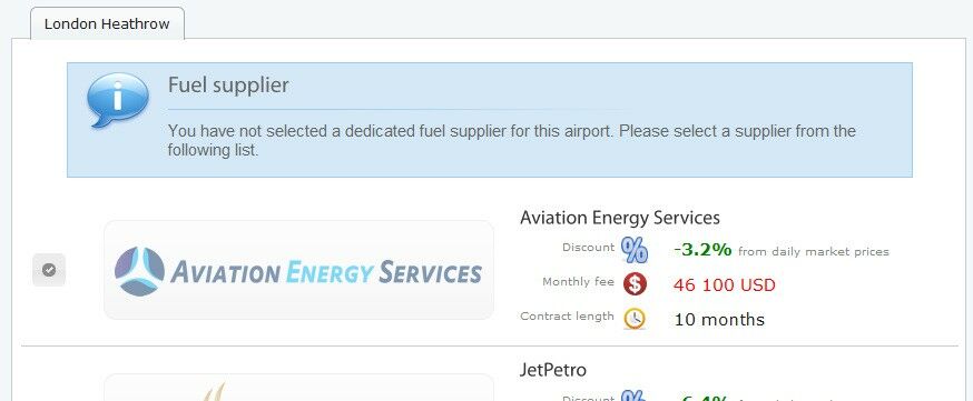 Each airline has the ability to negotiate fuel supplier contracts for each base airport. Every airport in the simulation world has at least one fuel company, larger airports have several companies to choose from.