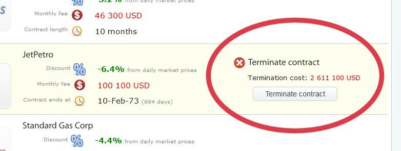 The supplier contract may be terminated up to three weeks before the contract ends. Termination will cost the player 50% of the remaining fixed monthly fees. If contract will end in less than three weeks it may not be terminated anymore, but only extended. The player will be notified about the contract expiration three weeks in advance, in case he wishes to extend it.