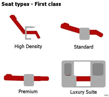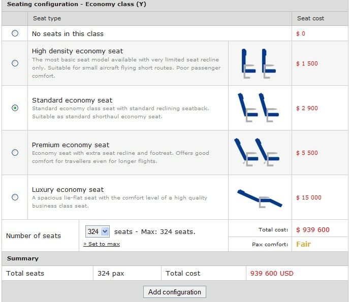 Remember that using premium or luxury configuration is not the right choice automatically as they do take much space on the aircraft - meaning less paying passengers and at some point less ticket income. You must find the correct balance between the ticket prices, number of passengers and their ride comfort. Usually the factory standard configuration is a good starting point and when your airline grows you can experiment more to learn the differences.