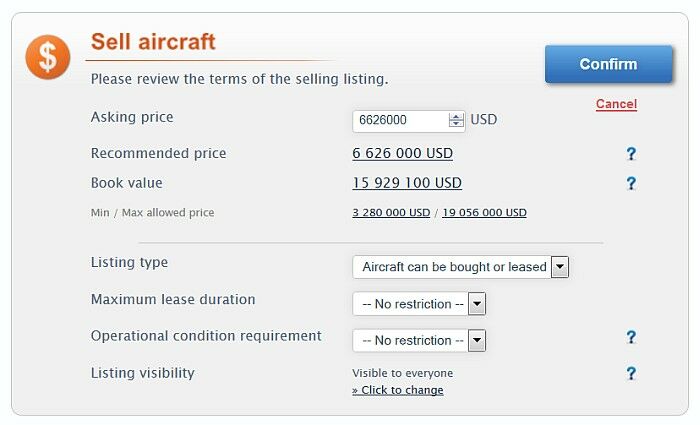 - Asking price - This is the price the plane can be bought. The monthly leasing price will be automatically calculated by the system.
