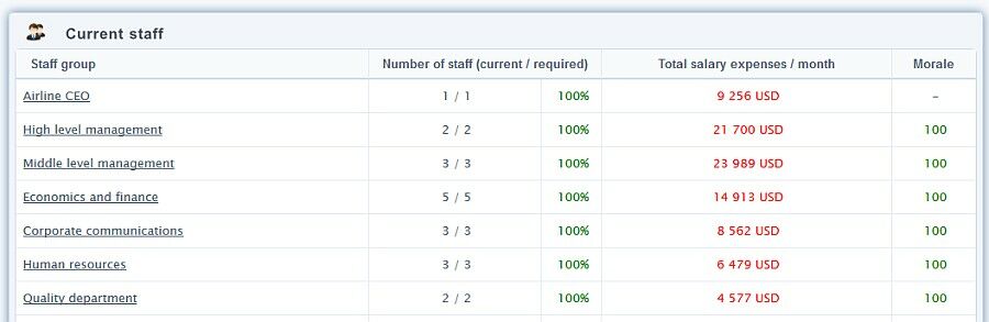 There are almost 20 different staff groups that your airline may need to employ. You can view a short description of their tasks from the Personnel Office page (scroll down to "Manage Staff" section). When your airline is small some of these groups are not required (the staffing requirement is zero).