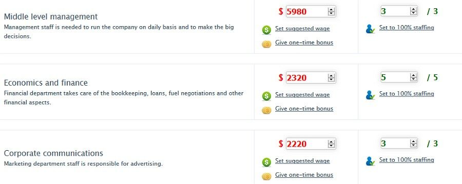 Tip: If you wish to save the last few bucks on your staff expenses you can set the "CEO Salary" to zero. Since this is your virtual salary setting it to minimal values has no negative effects. CEO has also never a morale value.