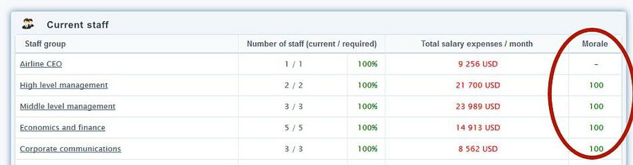 The normal value is in the high positive figures, from 60 to 100. Anything below this would require your attention. When you start your airline the morale is initially around 40-60 and will normally start to grow. If everything is normal the morale will grow to around 90-100 and will require minimal or no attention from you.