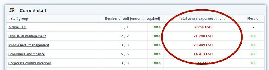 The actual salary paid out by your airline consists of the fixed monthly salary and the mandatory social fees. The fees are calculated automatically and are between 20-40% of the salary amount - you can see the grand total what you pay per employee at the top part of the staff page, at the Current Staff section while the monthly salaries are seen at the bottom part (Manage Staff section).
