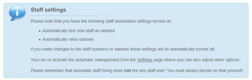 For instance, if you have automated staff hiring turned on and you manually hire more staff, the automated hiring is then turned off since the system assumes that you wish to do this manually from now on.