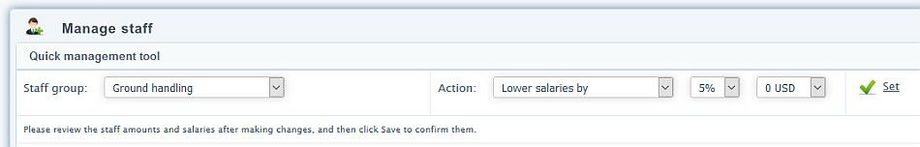 When managing staff numbers or salaries manually you have several options on how to do this. The easiest by far is to use the Quick management tool selectors at the top section of the staff management area. These tools let you easily manage all aspects of the staff groups with a click of a few buttons: Simply choose what you wish to do, click Set and then click Save to confirm the selections (always remember to Save the changes!).