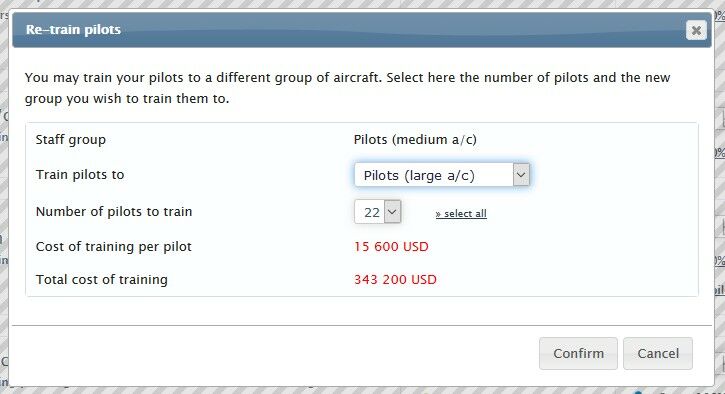 To use the re-training function scroll down to the management section of the staff page, and click on the re-train pilots link next to the group of your choice. You can then choose the group to which they should be trained to. Costs of these actions are shown under Staff Training line at the Income Statement page (together with the fixed fleet commonality related training costs).