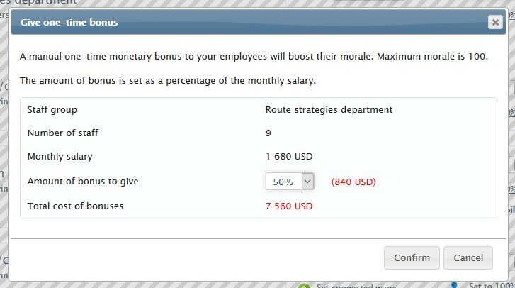 If you are having problems with the morale of your employees, you can manually choose to give a one-time bonus payment to the staff groups. For this you will need to use the Give one-time bonus link next to each staff group at the Manage Staff section.