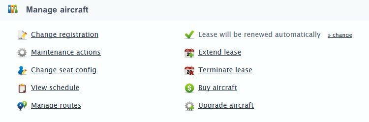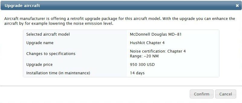 Each aircraft upgrade has a specific set of parameters and they can affect fuel consumption, runway requirement, range or noise level of the aircraft. The details, price of the upgrade and the installation time are displayed in the upgrade menu.