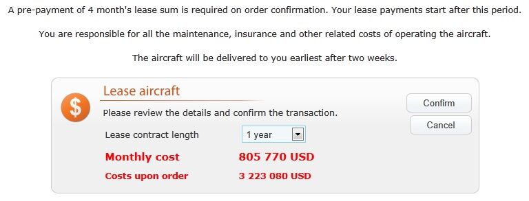 When you lease a new aircraft you are required to pay 4 months of leases in advance. Please note this when calculating the incomes of the company since the actual monthly lease costs will start to run only after 4 months.