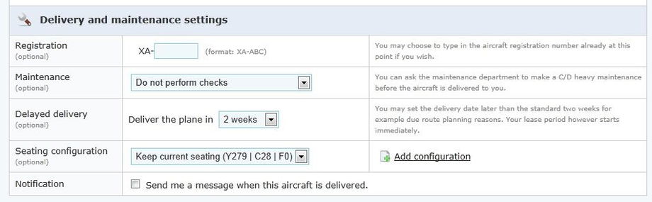 At the purchase/lease page you have the option to choose when the aircraft is delivered, what maintenance shall be performed before delivery and if the seating configuration should be changed (additional costs apply). You have also the option to assign the registration number (it can be also assigned later, and changed at any time later on too) and choose the base airport (if you have many of them). When everything is set simply confirm the order and the required money is deducted.